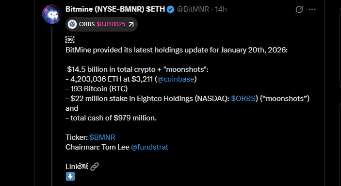 Bitmine Immersion Technologies announced that the number of Ethereum it holds is currently at 4,203,036 ETH as of January 19, 2026, with an estimated worth of $13.5 billion based on market price.