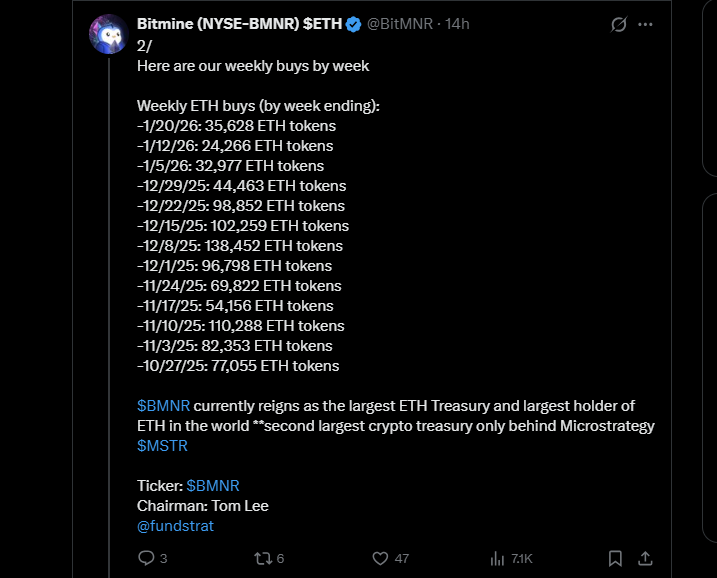 This puts Bitmine among the biggest Ethereum holders at present and cements its position as the leading Ethereum treasury management firm listed publicly.