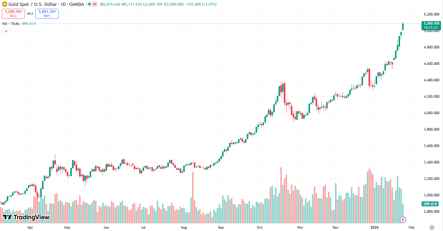 On January 26, 2026, gold reached a record $5,092.71/oz, extending a rally that followed a 60% gain in 2025. Three forces explain the move: