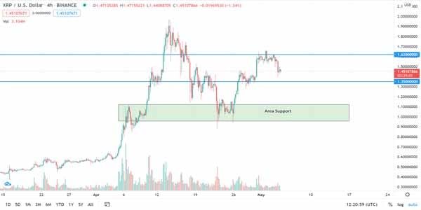 In my view, at this time frame, the price of XRP is in an Elliot Waves structure so a decline needs to be anticipated so that in this analysis, we have SR$1.35 and $1.62 levels, as well as the Support Area.
